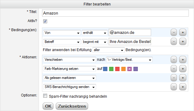 b1gMail bietet außerdem ein mächtiges Filter-System an, das bei Eingang von E-Mails, die selbst gewählten Kriterien entsprechen, automatisch bestimmte Aktionen auslösen kann, z.B. Beantwortung der E-Mail mit einer Vorlage, Versenden einer SMS-Benachrichtigung, Verschieben oder Markieren der E-Mail und mehr.